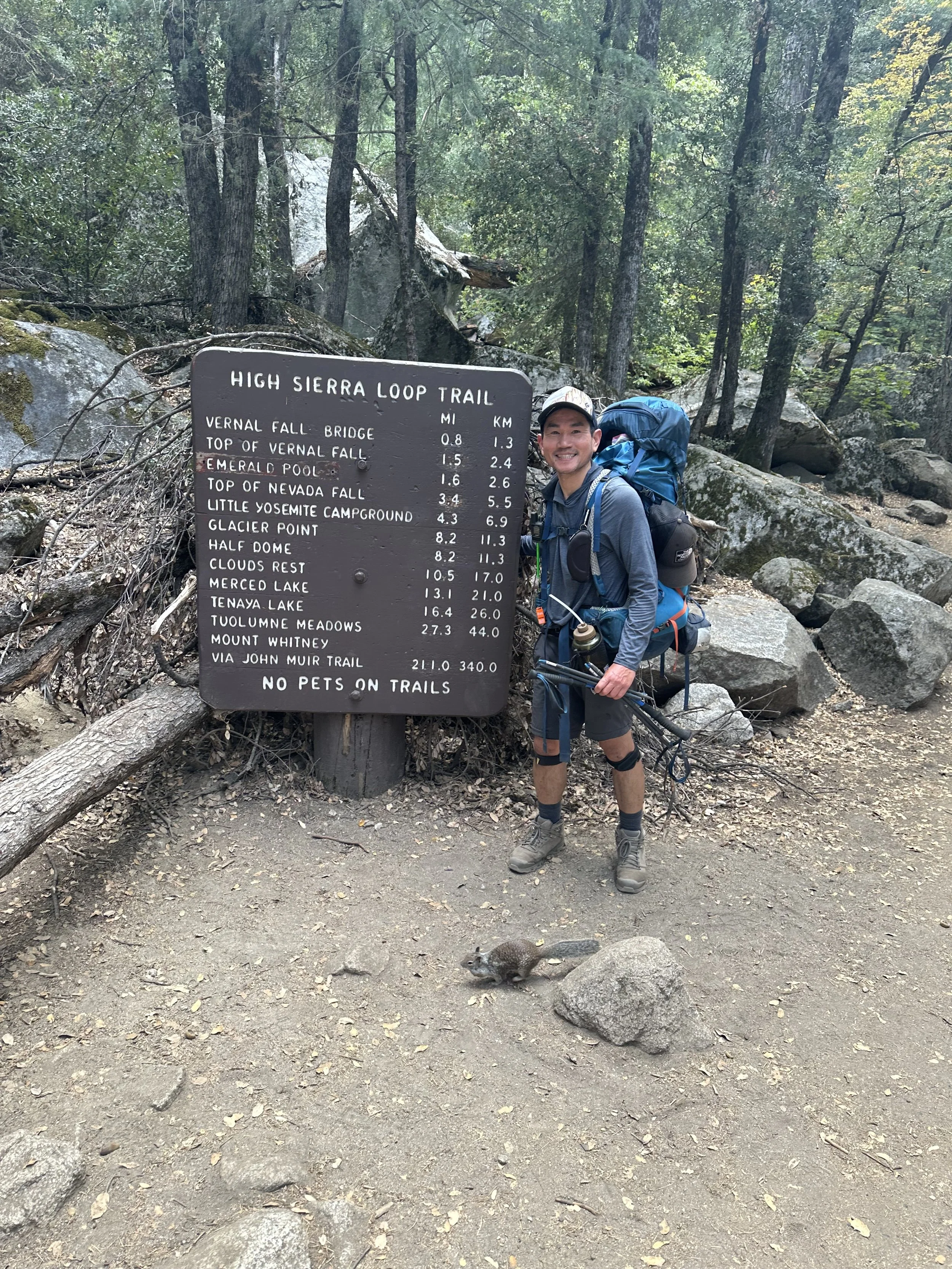 At the famous trailhead sign at the Happy Isles Trailhead in Yosemite National Park, the northern terminus of the John Muir Trail.